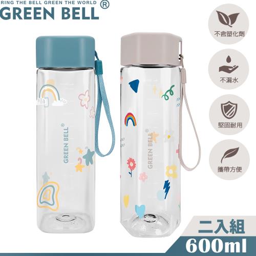 超值二入組【GREEN BELL 綠貝】手提童趣水壺600ml(多邊PC+四方Tritan)