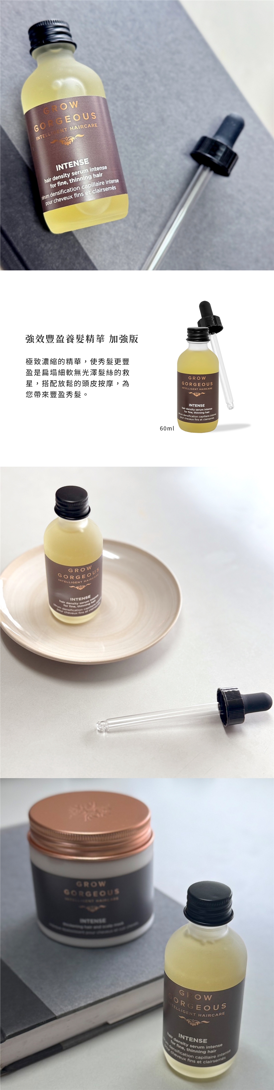 Grow Gorgeous 強效豐盈養髮精華,專為扁塌、細軟、無光澤的髮絲打造,讓秀髮重返豐盈感。