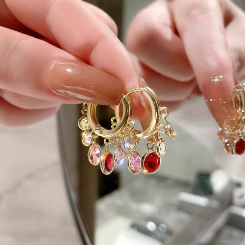 《Caroline》韓國熱賣粉色系水晶垂墜感耳扣耳環74007