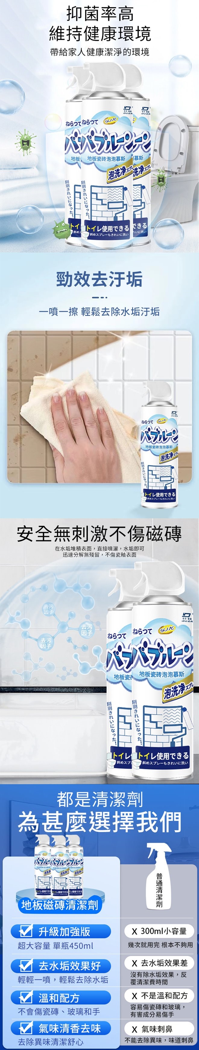 【日本熱銷地板瓷磚泡泡清潔慕斯450ml】特色說明: