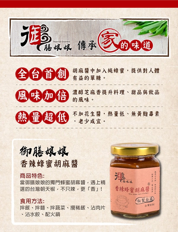御膳娘娘獨門的蜂蜜胡麻醬全系列,是您正餐的最佳良伴。
