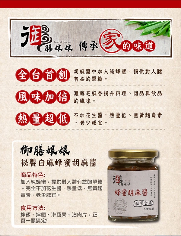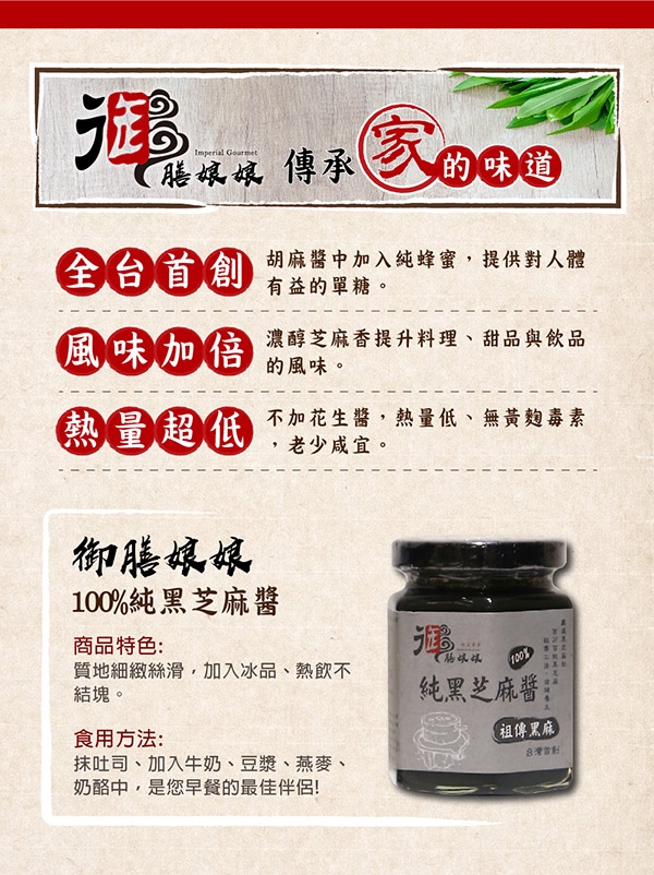 品名:《御膳娘娘》祕製白麻蜂蜜胡麻醬+100%純黑芝麻醬(180g/瓶,共2瓶)