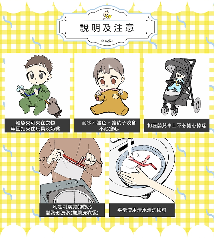 日系純棉的布料不只耐洗不退色,當孩子們不小心咬含的時候爸爸媽媽也不用擔心,結實牢固的鱷魚夾能牢牢的夾在孩子們的衣物或是嬰兒推車上,不怕因扯動而掉落。除了當作奶嘴帶以外也能扣住玩具夾在推車上帶給孩子們歡樂!