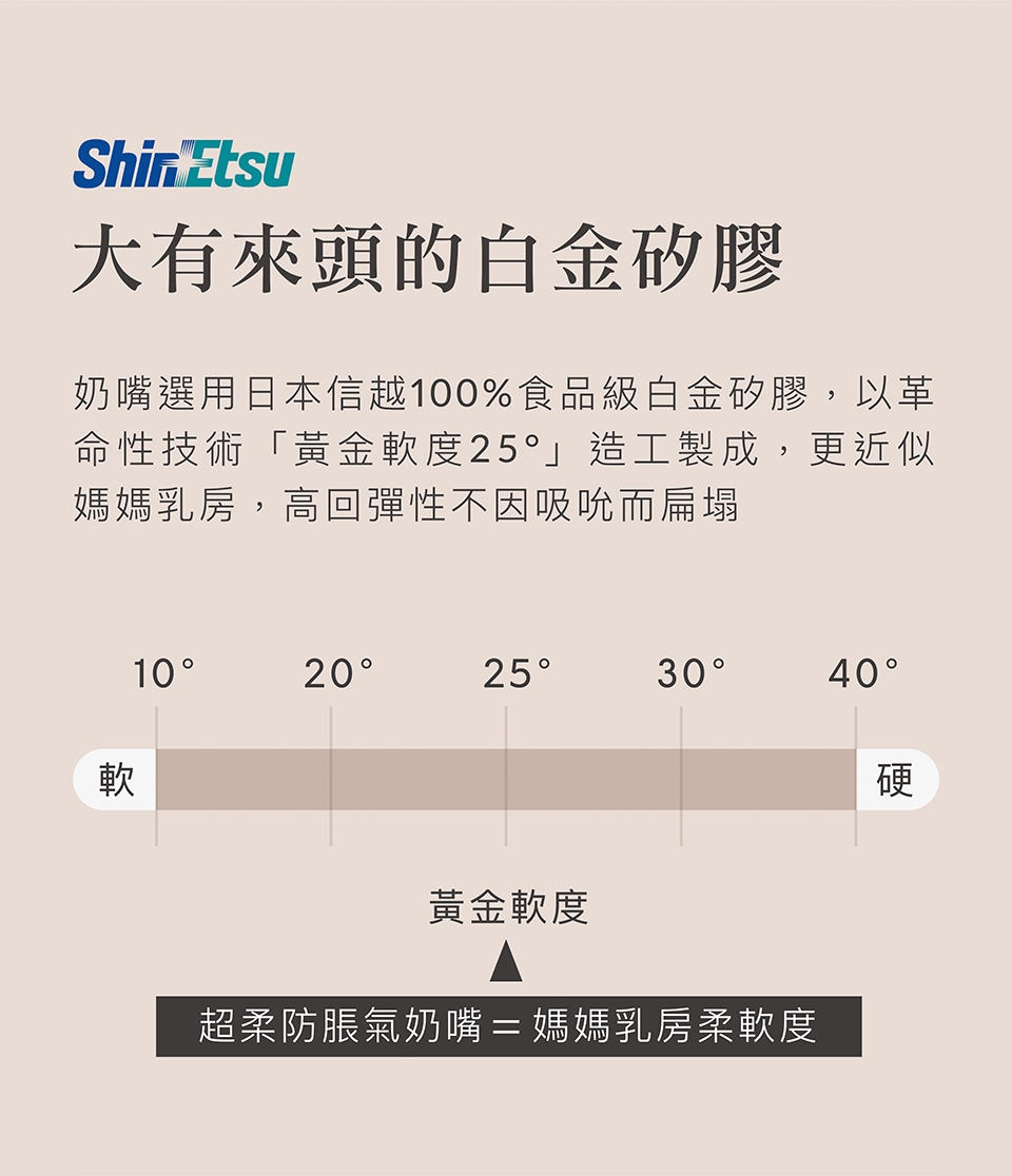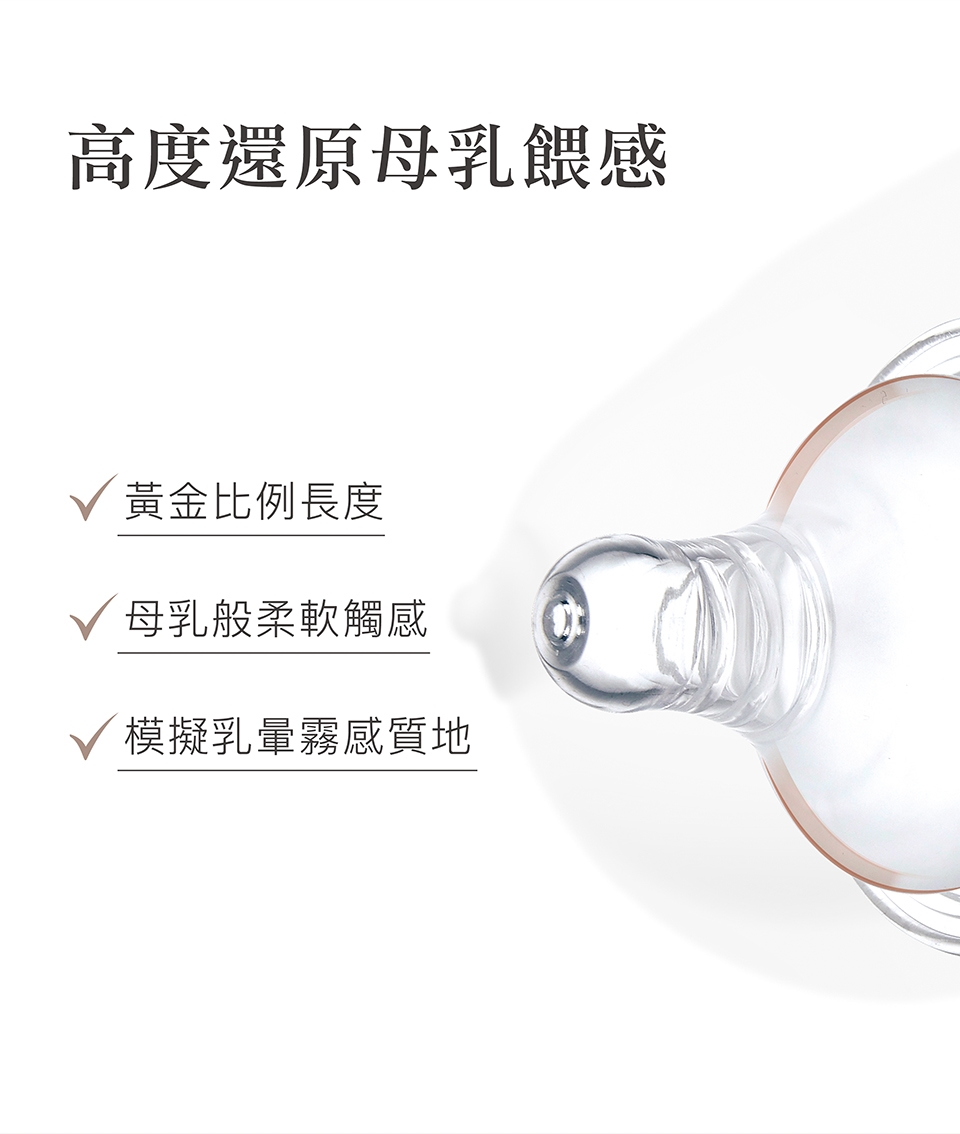 ●專為新生兒打造白金級奶嘴,擬造媽媽乳房觸感。