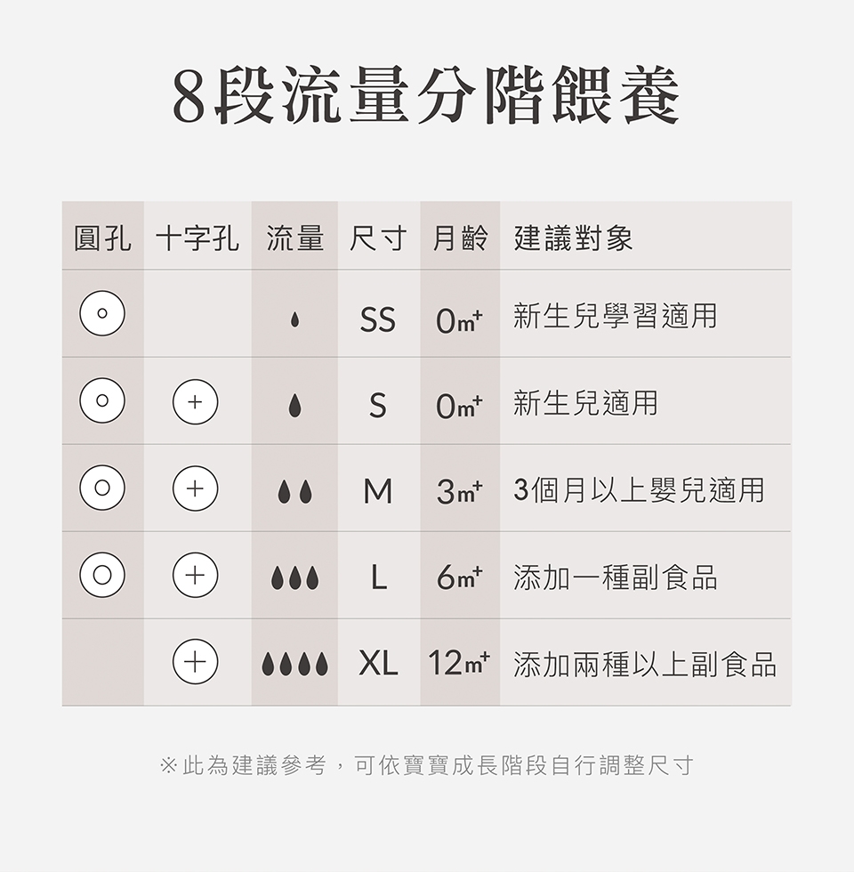 使用本產品前應確實清洗及消毒,並依寶寶吸吮能力、副食品濃稠度...等實際使用狀況,替換適合的孔徑與尺寸。