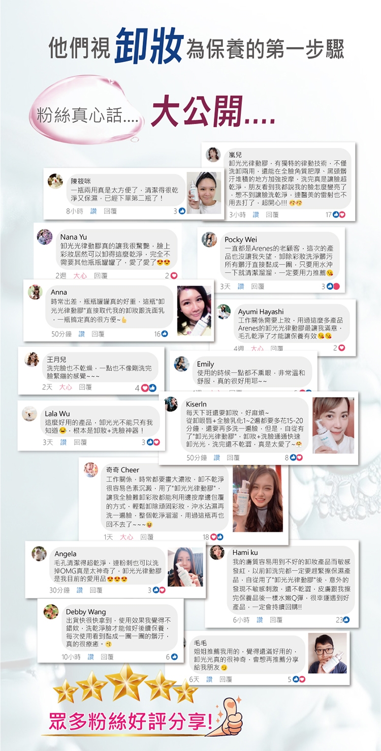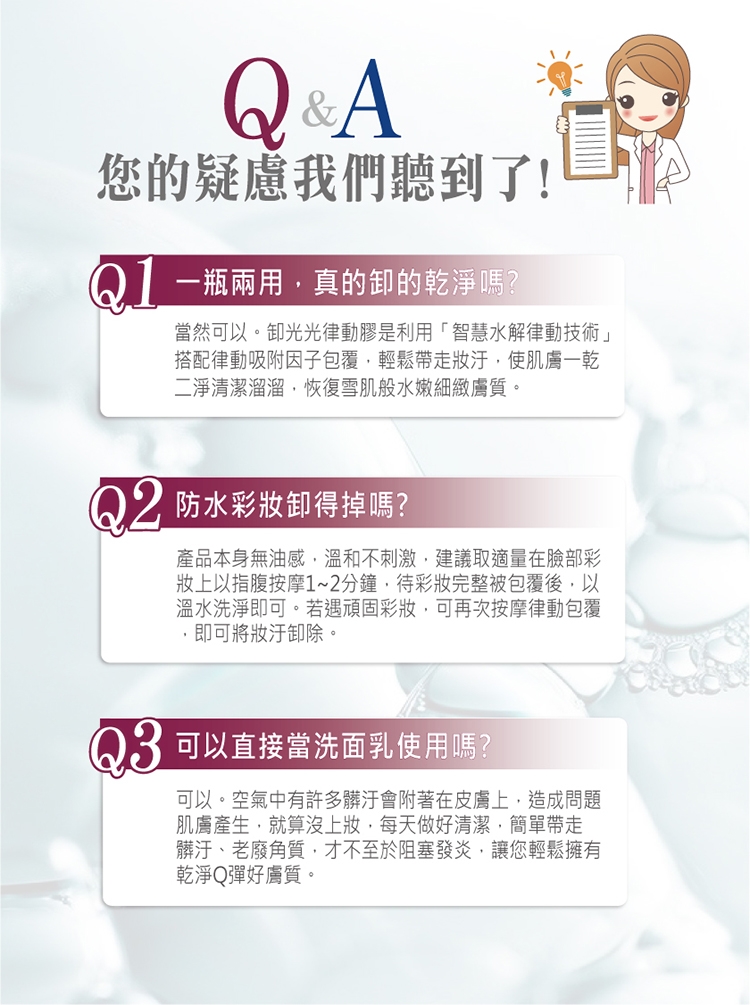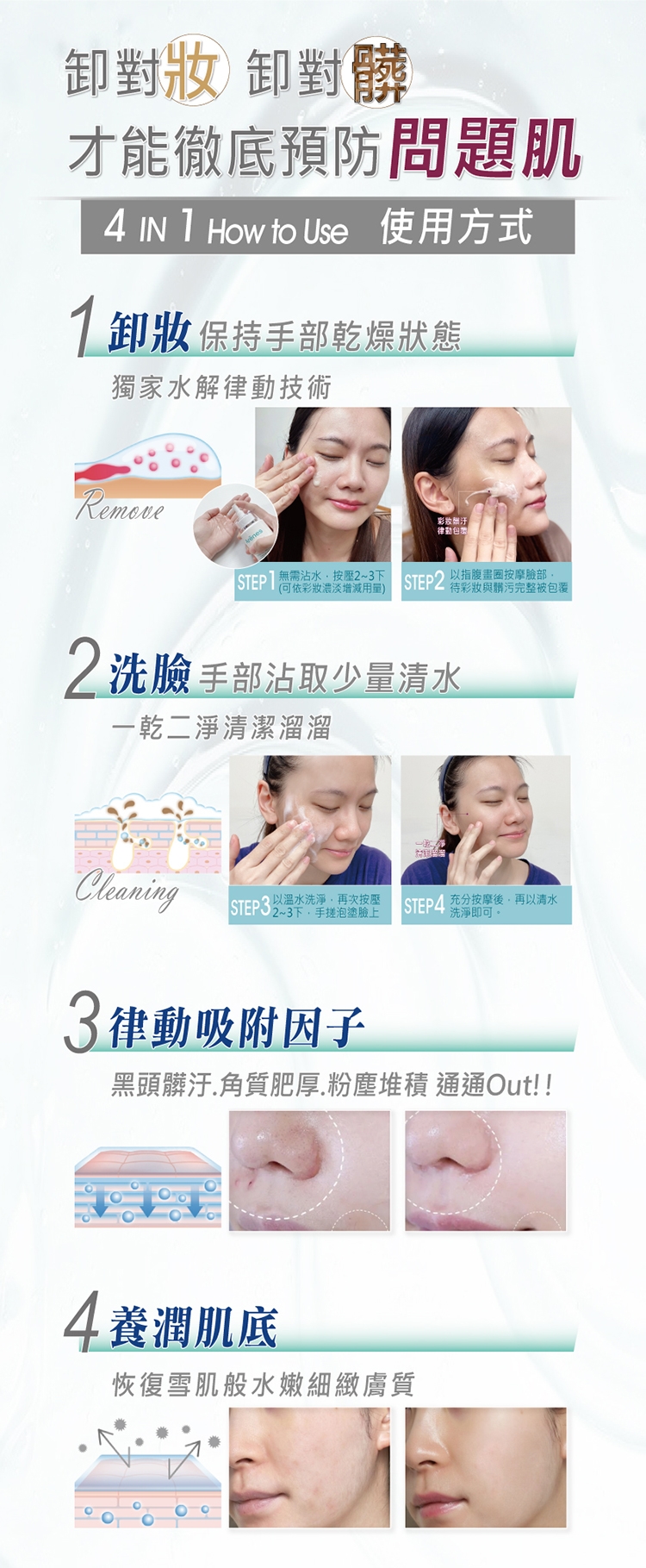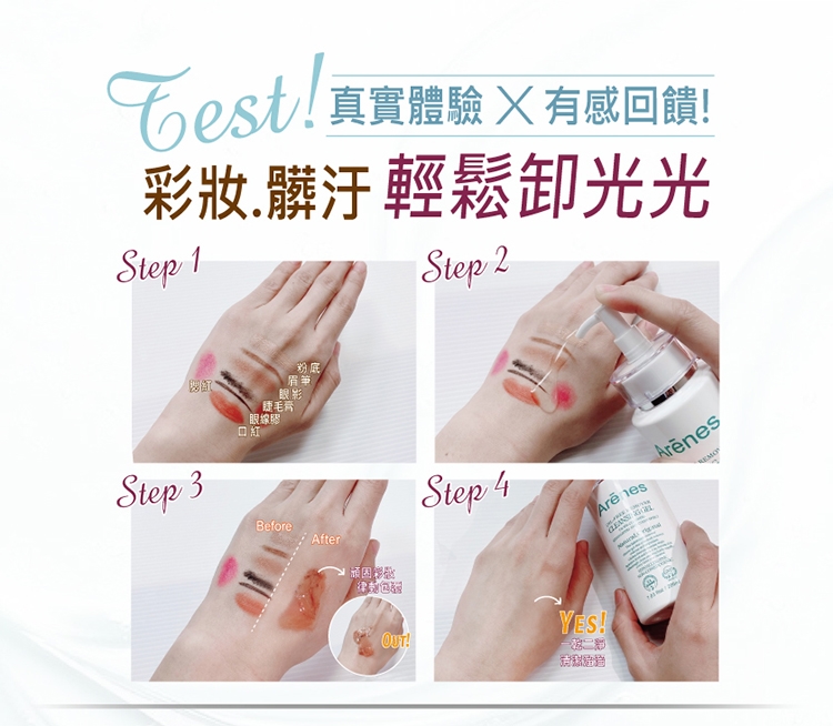 取適量於乾燥手掌心,可依彩妝濃淡增減用量,以指腹畫圈按摩臉部,待彩妝與髒污完整被包覆後,以溫水洗淨即可。未上妝也可使用。