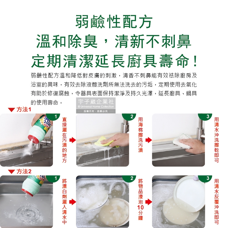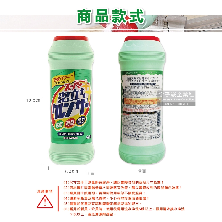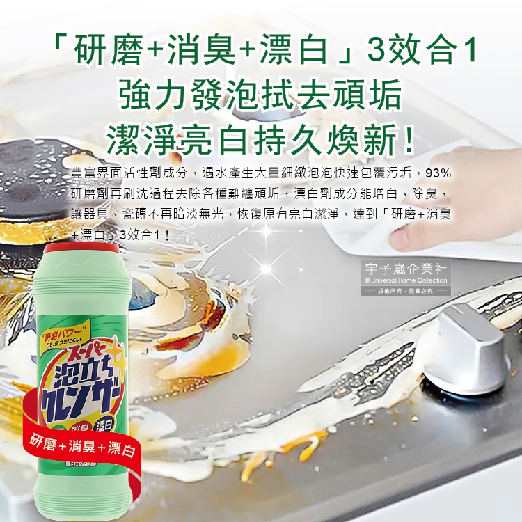 ●品名:廚房衛浴3效合1研磨拋光潔淨亮白除臭去油污除水漬強力發泡漂白粉