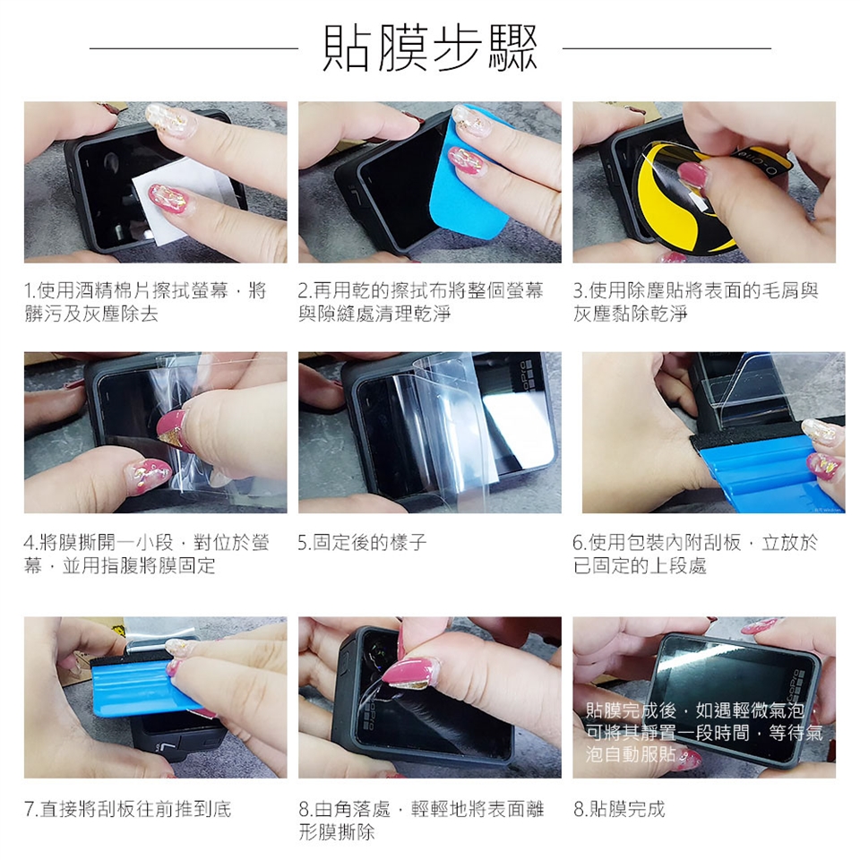 商品詳細介紹 體驗說明 不可體驗 使用方法說明 先以酒精棉片清潔螢幕,再用擦拭布擦乾,最後用除塵貼黏起灰塵;待孔位正確,黏合固定住,用刮板將膜撫平,小心撕除最上層表面離型膜,並撫平四周貼合 注意事項 請參考貼膜步驟