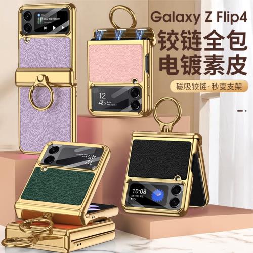 適用三星Zflip4手機殼F7210磁吸中軸鉸鏈全包flip4指環素皮殼新款W23 flip折疊屏后殼翻蓋機全包外殼小屏膜殼