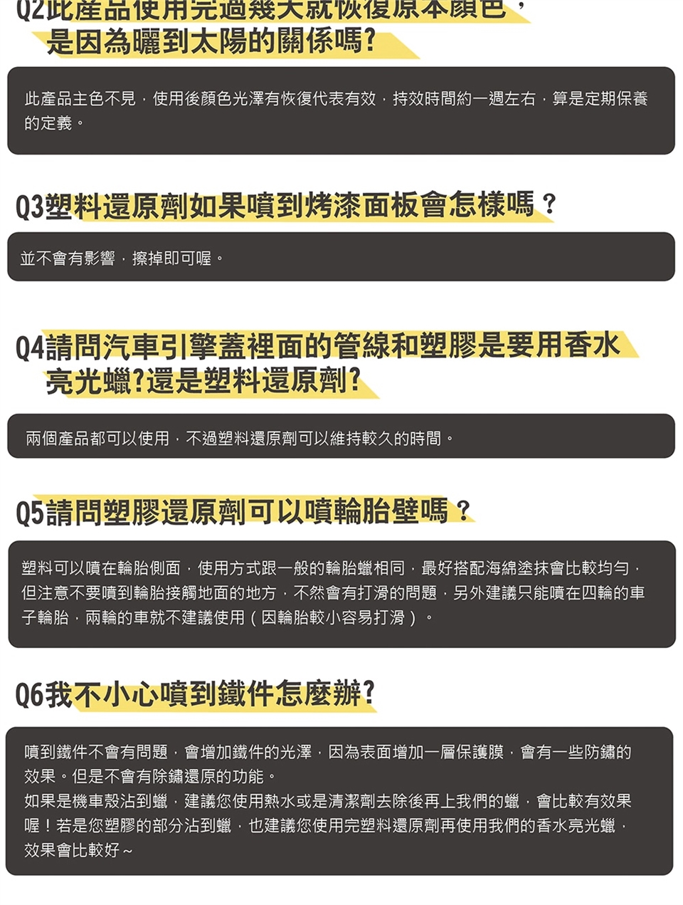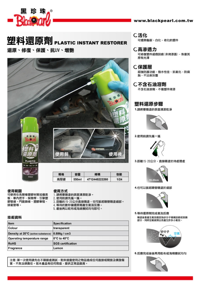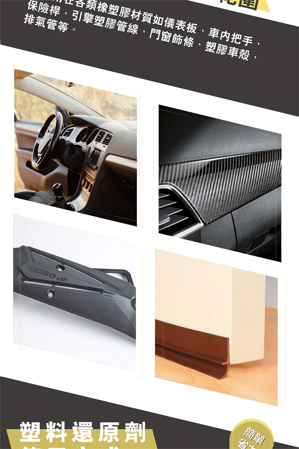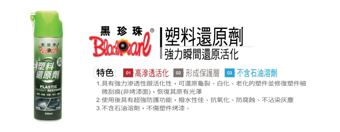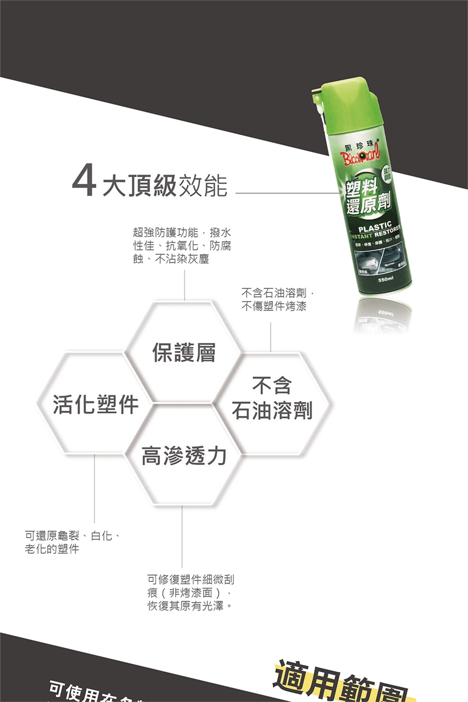 可使用在各類橡塑膠材質如儀表板、車內把手、保險桿、引擎塑膠管線、門窗飾條、塑膠車殼、排氣管等。