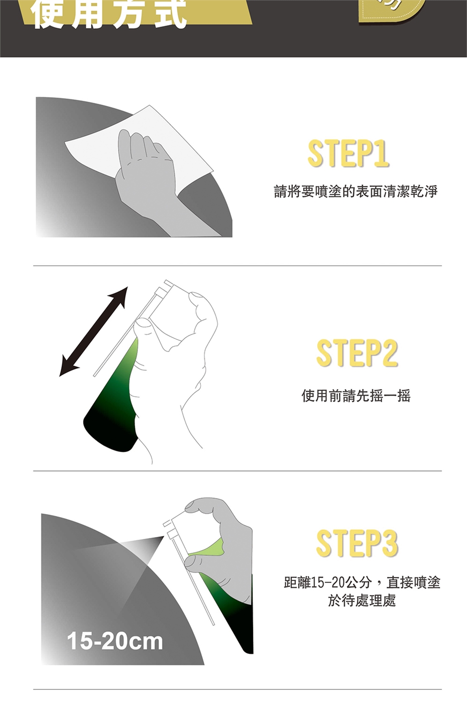 3.距離約15-20公分直接噴塗,也可扳起噴管噴塗細部。