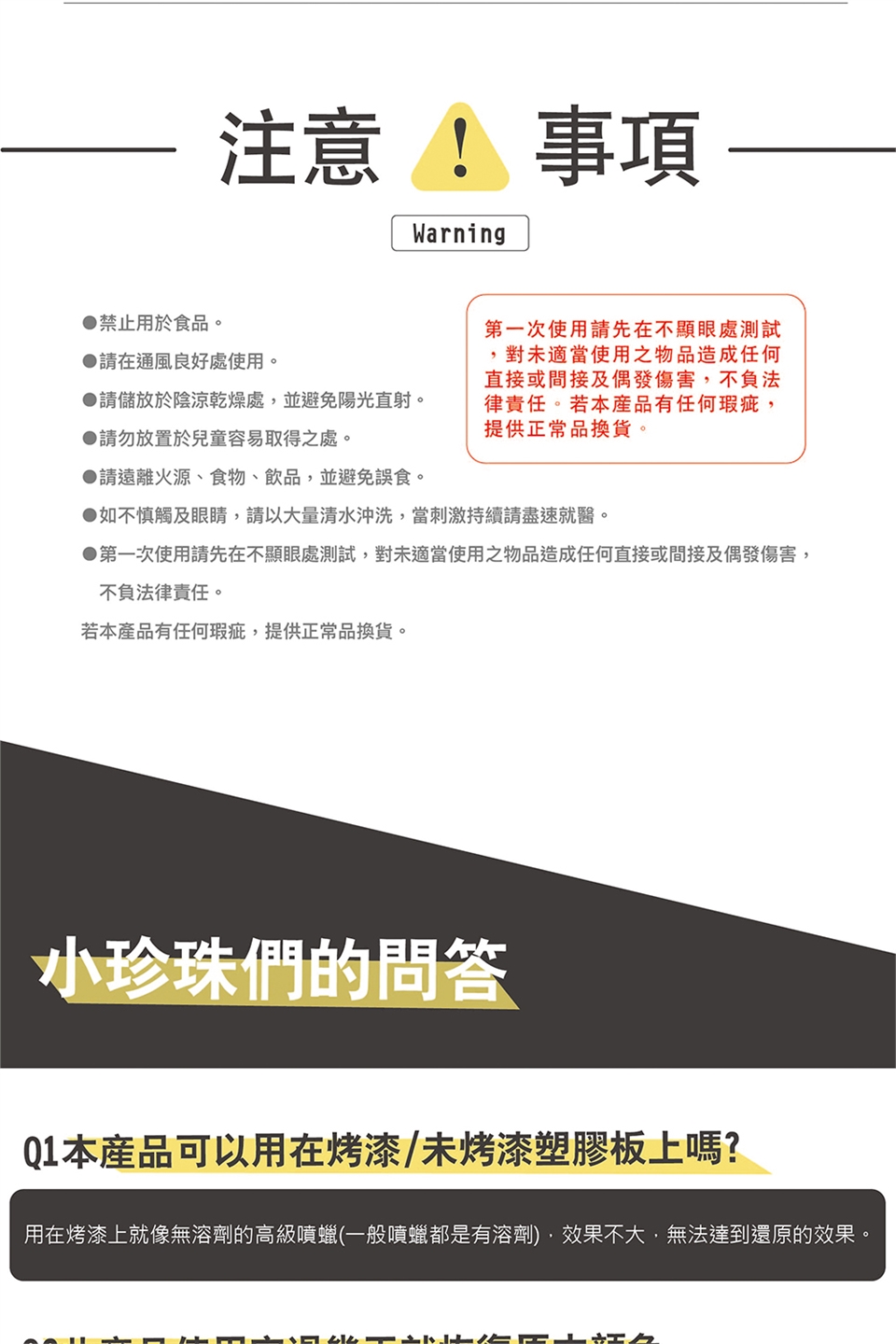 第一次使用請先在不顯眼處測試,對未適當使用之物品造成任何直接或間接及偶發傷害,不負法律責任。若本產品有任何瑕疵,提供正常品換貨。