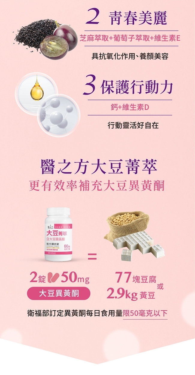 內容物成分: :檸檬酸鈣、山藥粉、大豆萃取物、微結晶狀α-纖維素、聚乙烯吡咯烷酮、保健食品專用膜衣(含羥丙基甲基纖維素、羥丙基纖維素、聚乙二醇)、二氧化矽、紅花苜蓿萃取物(含紅花苜蓿萃取物、麥芽糊精)、芝麻萃取物(含芝麻萃取物、麥芽糊精)、維生素E (含維生素E、辛烯基丁二酸鈉澱粉、麥芽糊精、二氧化矽)、葡萄籽萃取物、硬脂酸鎂、二氧化鈦、維生素D3[含辛烯基丁二酸鈉澱粉、蔗糖、L-抗壞血酸鈉(抗氧化劑)、中鏈三酸甘油酯、二氧化矽、維生素E(抗氧化劑)、維生素D3]、食用紅色四十號鋁麗基、食用黃色五號鋁麗基