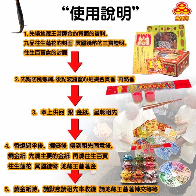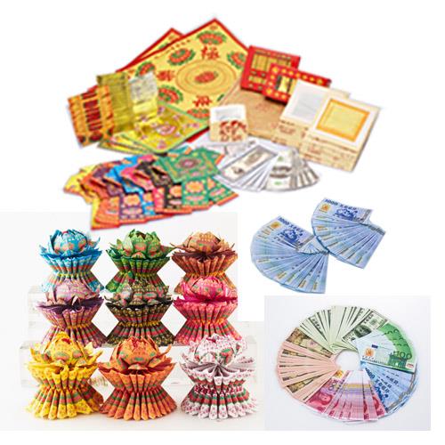 普渡, 清明或是祭祖一定要用的超齊全超豪華的組合, 剛往生的親人或是一年祭拜一次的親人, 提供一年分或是提供充足的物品跟錢財讓親人在天上的日子好過,往生百寶盒+九轉迷你往生蓮花+五合一的冥國錢幣( 歐美日人台) 每種100張+ 冥國台幣五百張