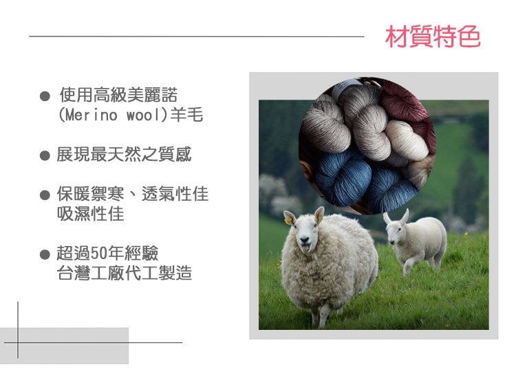 ● 羊毛具天然保護結構,保暖、透氣性佳、吸濕性佳。