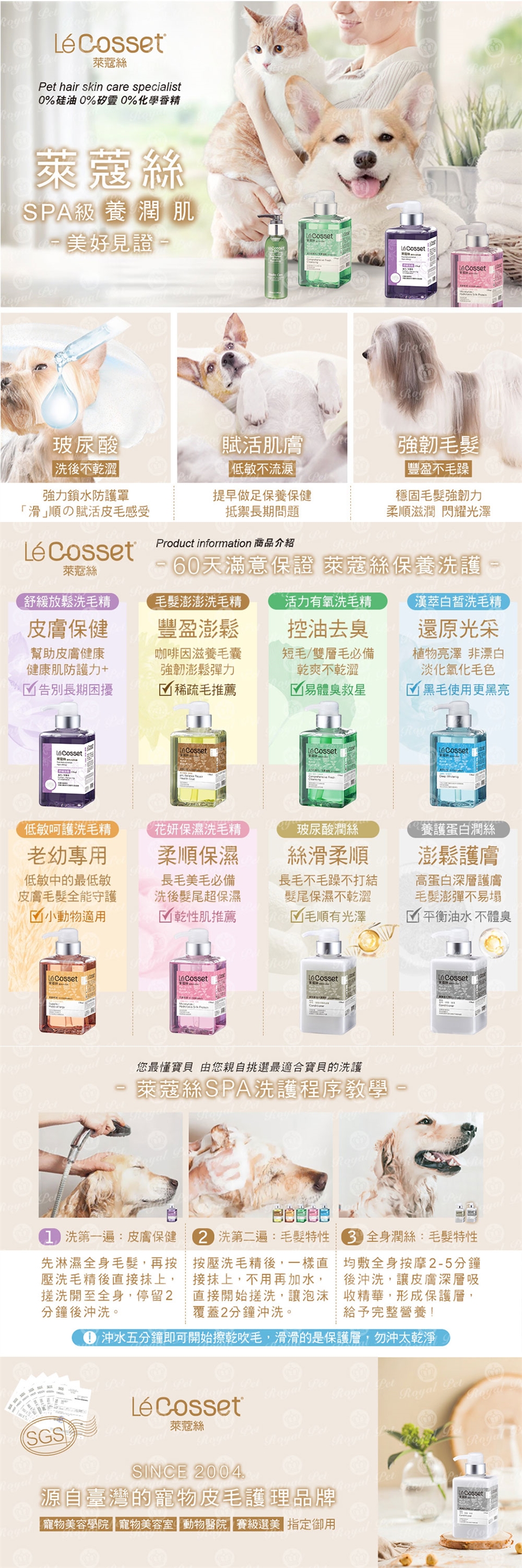 草本保健皮膚配方,另添加保養品級玻尿酸! 皮膚毛髮全面守護最佳選擇「萊蔻絲頂級SPA寵物洗毛精」。