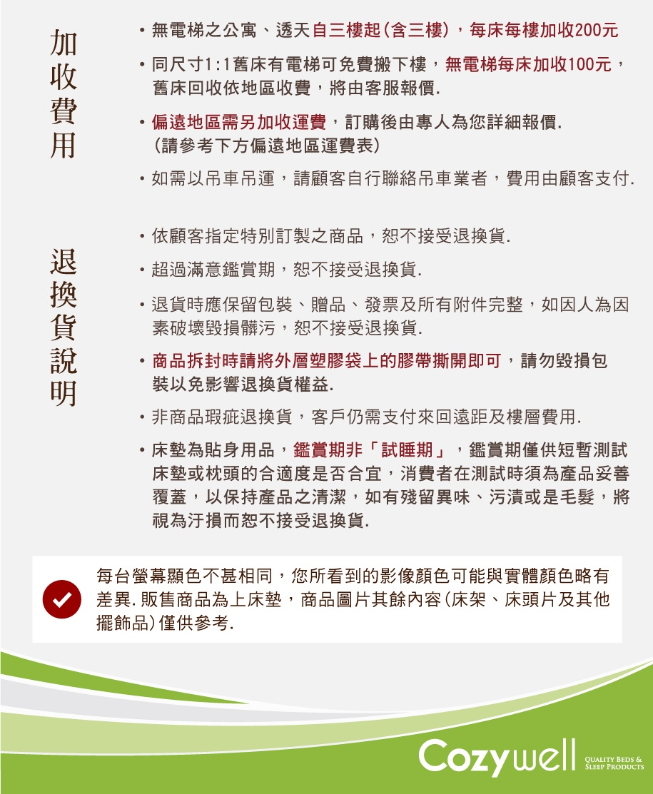 ‧電梯華廈,統一以電梯載運,恕無法經樓梯徒手搬運,無電梯之公寓,自三樓起算(含三樓),每床、每層樓加收200元搬運費。