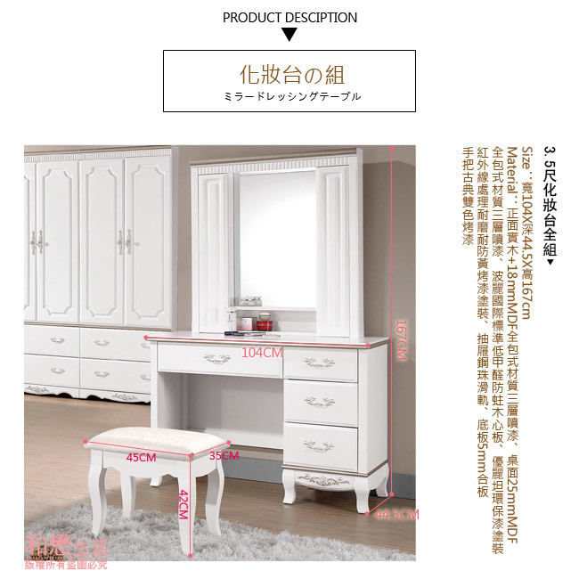 【優利亞-諾德純白】3.5尺化妝台+椅~華麗歐風貴氣造型,優雅脫俗、亮麗出眾展現獨特的室內美感。化妝台上座中間為鏡面設計,左右兩側為可開式置物空間格,可放置化妝用品;鏡台下座為四抽抽屜設計,可放置私人用品,方便收納;而材質部分正面為實木+18mmMDF全包式材質三層噴漆,側板為國際標準低甲醛波麗木心板,塗裝為優麗坦環保漆,經紅外線處理、耐磨、耐防黃烤漆;抽屜為鋼珠滑軌底板為5mm合板;手把為古典雙色烤漆手把,質感一流,且商品均由專人配送到府組裝不用擔心安裝的問題。