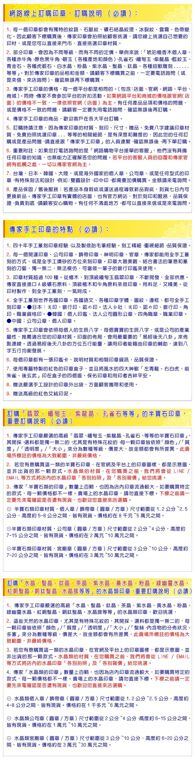3. 訂購須知(必讀):品項、數量、刻工、印章的紋理和獨特性、品質保證說明。