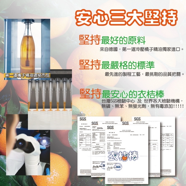 ● 天然冷壓橘子油與椰子油衍生物所組成之植物性清潔配方,具有效清潔力,且易清洗不殘留。