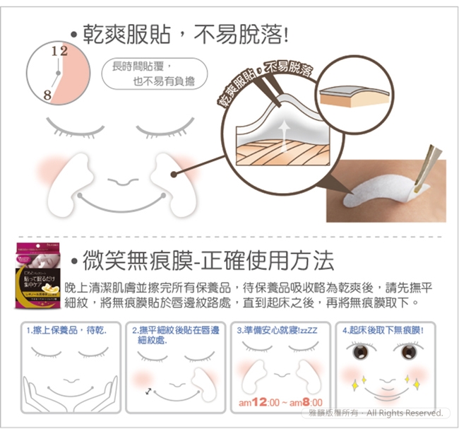 用法:夜間擦完所有的保養品之後,請先撫平細紋,再將產品貼於紋路處,直到起床之後,再將其取下。