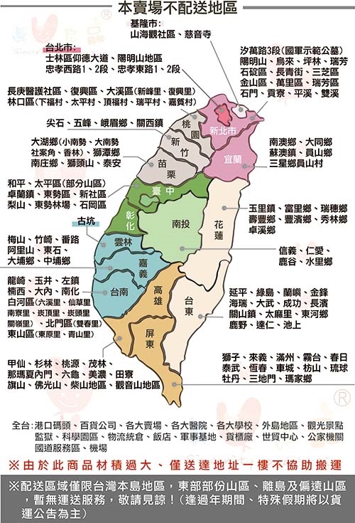 ※偏遠地區、山區、部份公司行號(力晶科技、鉅晶、矽導、友達、聯電、聯合大樓、啟基、台積電、鴻海科技、緯創科技、久元電子、旺宏電子、工業技術研究院、精材科技、台塑相關企業)、大賣場、有館內物流的百貨公司、購物中心、倉儲統倉、監獄、看守所、貨櫃場、進出口碼頭、軍用碼頭,暫無運送服務,敬請見諒;如有貨運配送困難之地區,我司將保留訂單出貨權利,謝謝。