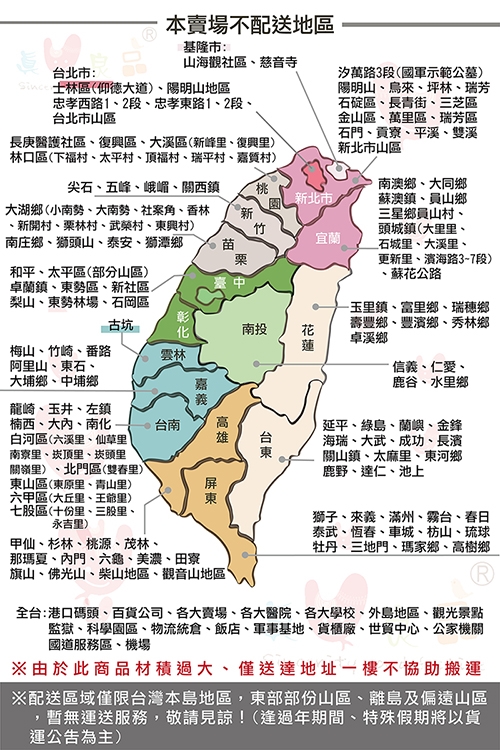 ※大賣場、有館內物流的百貨公司或購物中心、倉儲統倉、監獄、看守所、貨櫃場、進出口碼頭、軍用碼頭,暫無運送服務,敬請見諒!