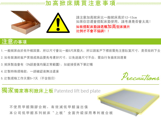 - 採用低甲醛F3掀床材質,品質安心,為您健康把關