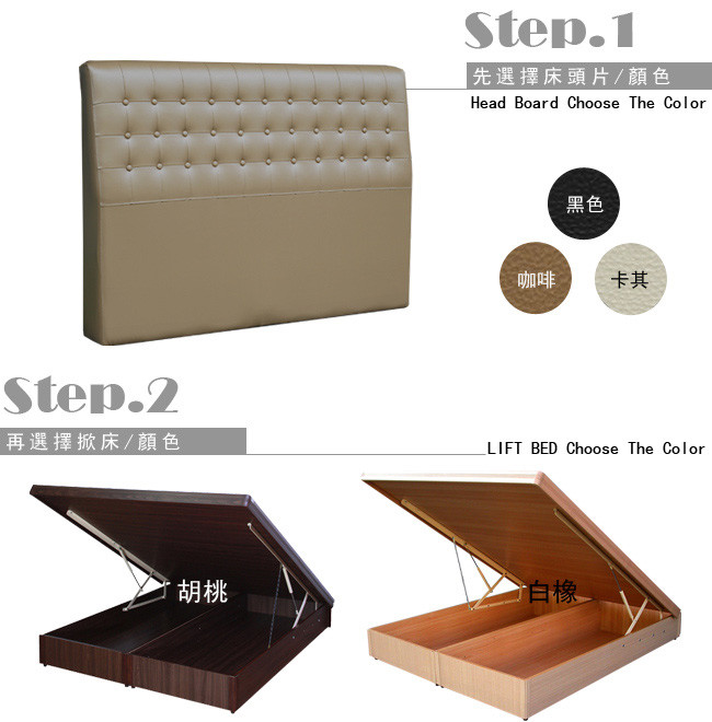- 掀床共有『胡桃色、白橡色』2種色系可供選擇,共有6種組合,可以讓您任意搭配,