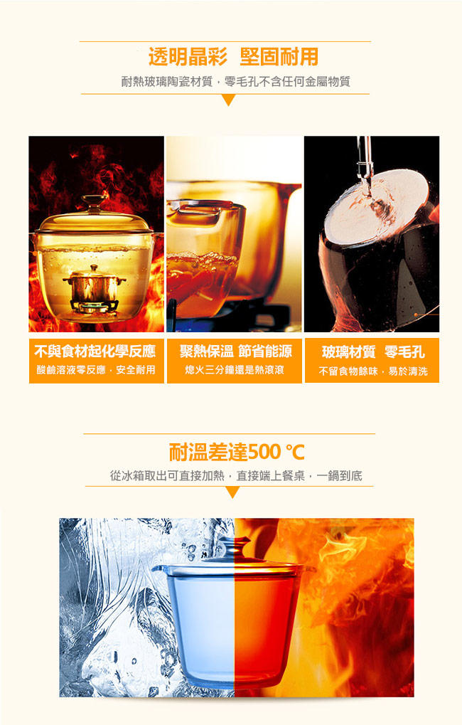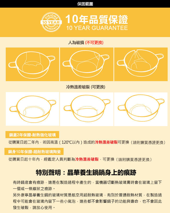 ●鍋身,十年保固,從購買日起十年內,若鍋身因冷熱溫差而破裂可免費更換。(更換商品請附購買憑證)