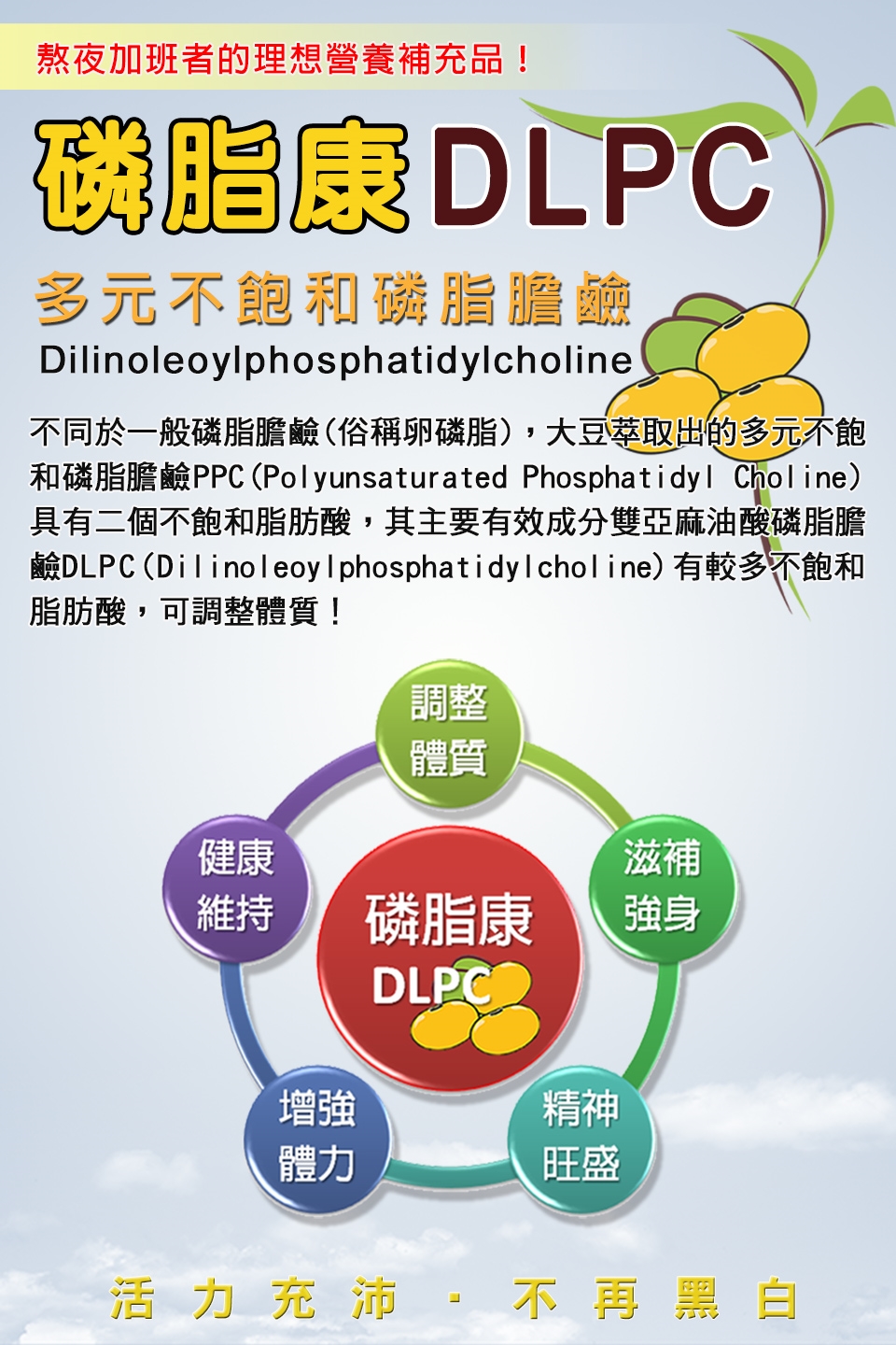 不同於一般磷脂膽鹼(俗稱卵磷脂),大豆萃取出的多元不飽和磷脂膽PPC(polyunsaturated phosphatidylcholine)具有二個不飽和脂肪酸,其主要有效成分雙亞麻油酸磷脂膽鹼dlpc(dilinoleoylphosphatidylcholine)有較多不飽和脂肪酸,生理效能更高!