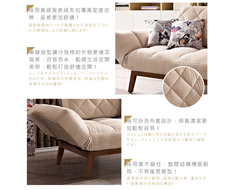 沙發採用高級絨布,抱枕採用精選棉麻布,觸感舒適,細緻極具質感!