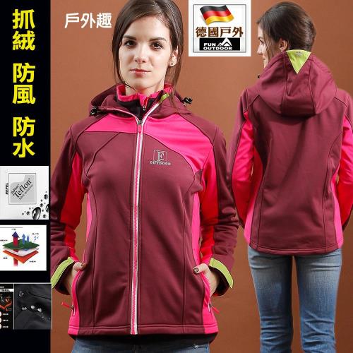 【德國-戶外趣】女款連帽禦寒斜肩曲線全防水抗風軟殼刷毛外套 ( HJL002S 紫玫 )