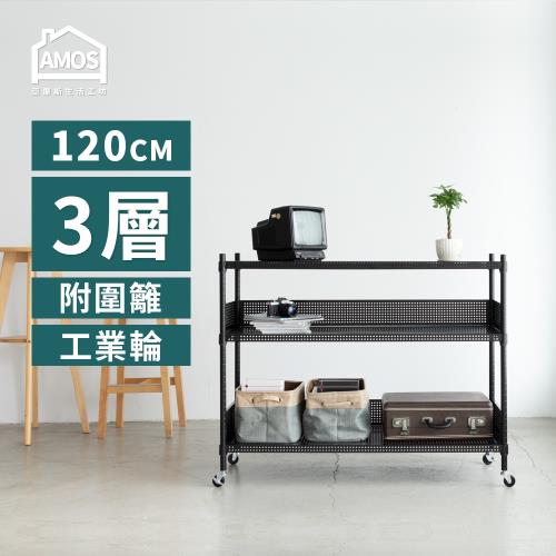 【Amos】超穩耐重鐵力士+輪 121x46x97三層增高置物架/收納層架+2組圍籬