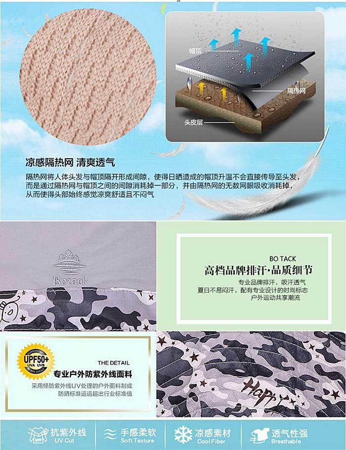 (5)側邊透氣,帽體中部有一圈的透氣窗,裡面配透氣網眼,極大地提高了透氣排汗的作用,讓您清涼一夏。