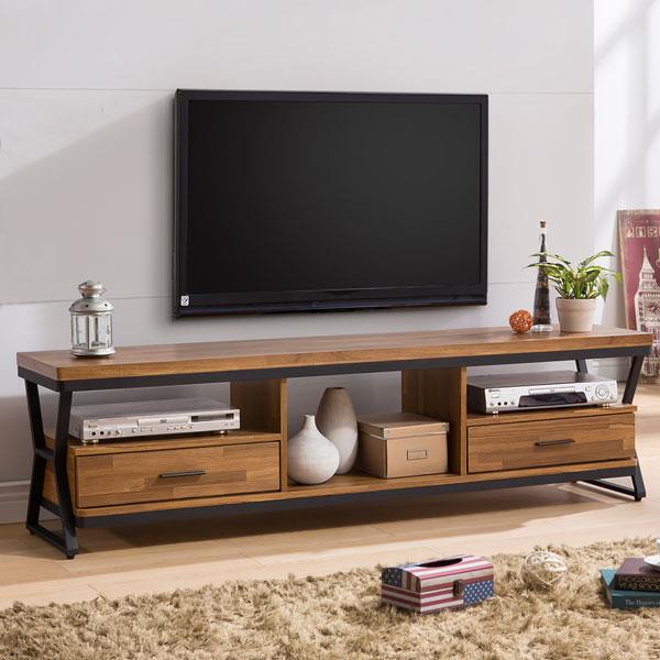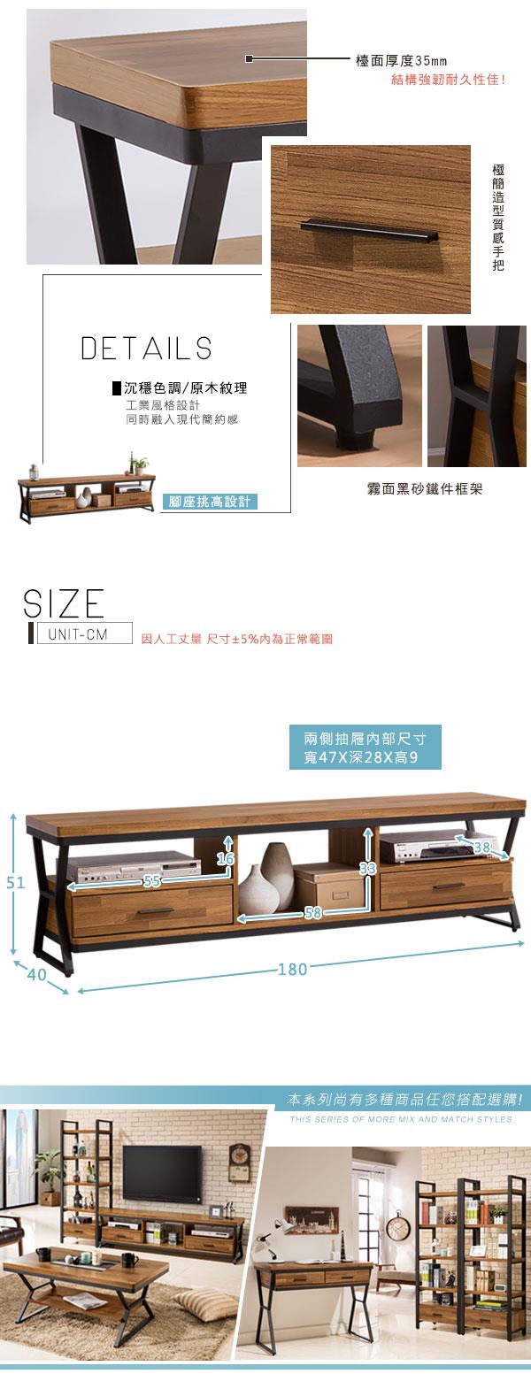 Homelike 凱瑟琳工業風6尺電視櫃,運用霧面黑砂鐵件框架,穩固不易搖晃且堅固耐用,加上沉穩色調的原木紋理,極簡造型質感手把,腳座挑高,隔離地面濕氣,開放式+兩側雙抽屜置物空間,收納更多元,檯面厚達35mm,結構強韌耐久性佳,抽屜採用高級鋼珠滑軌,使用順手拉和更輕鬆不費力,工業風格設計,同時融入現代簡約感,展現了它獨特的魅力,喜愛現代工業風又不想撞款的您,怎能錯過!