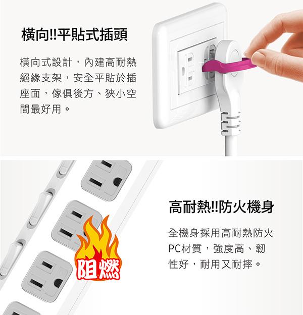 採用橫向平貼式插頭,薄型設計,使插頭安全平貼於插座面