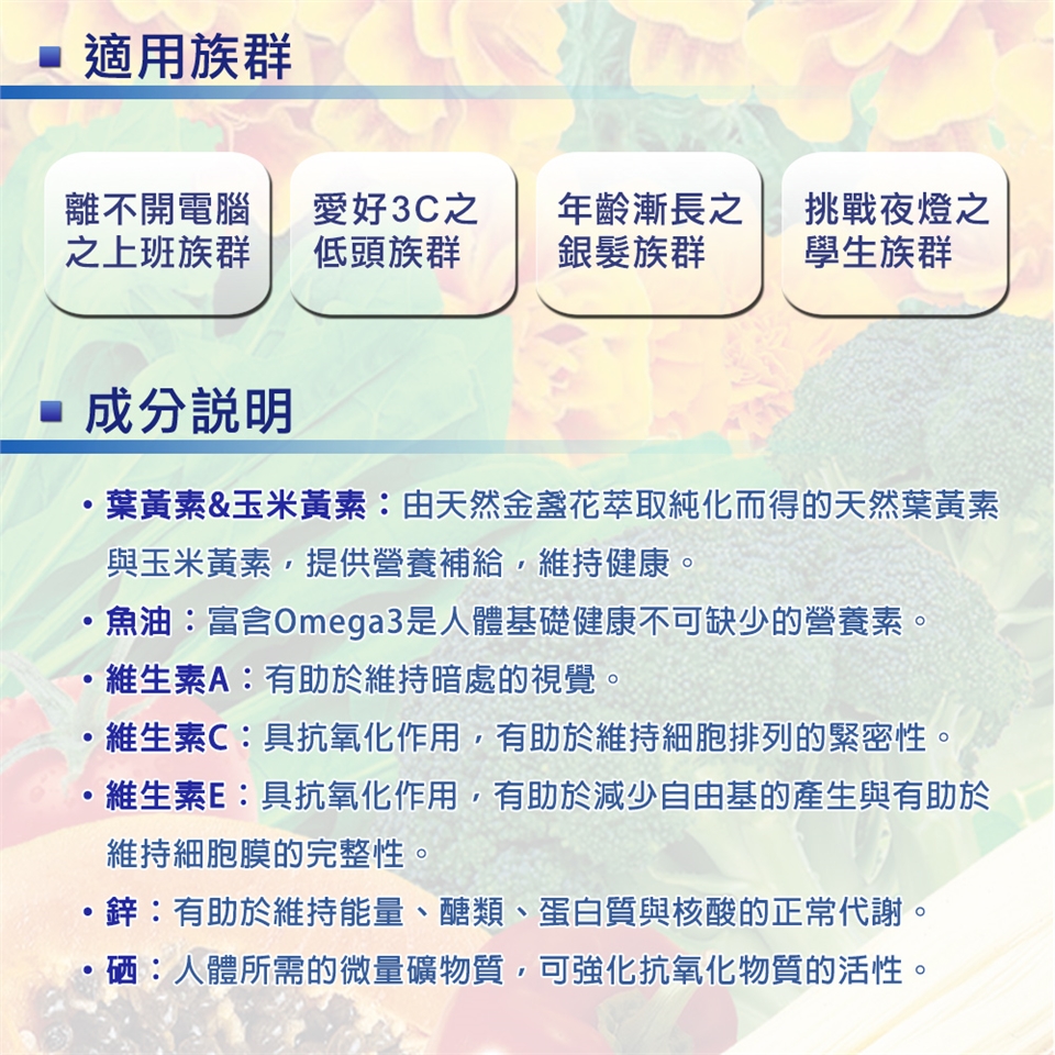 ☆搭配完整抗氧化配方—維生素A、維生素C、維生素E、鋅、硒與富含DHA、EPA的深海魚油,保健功效更全面!