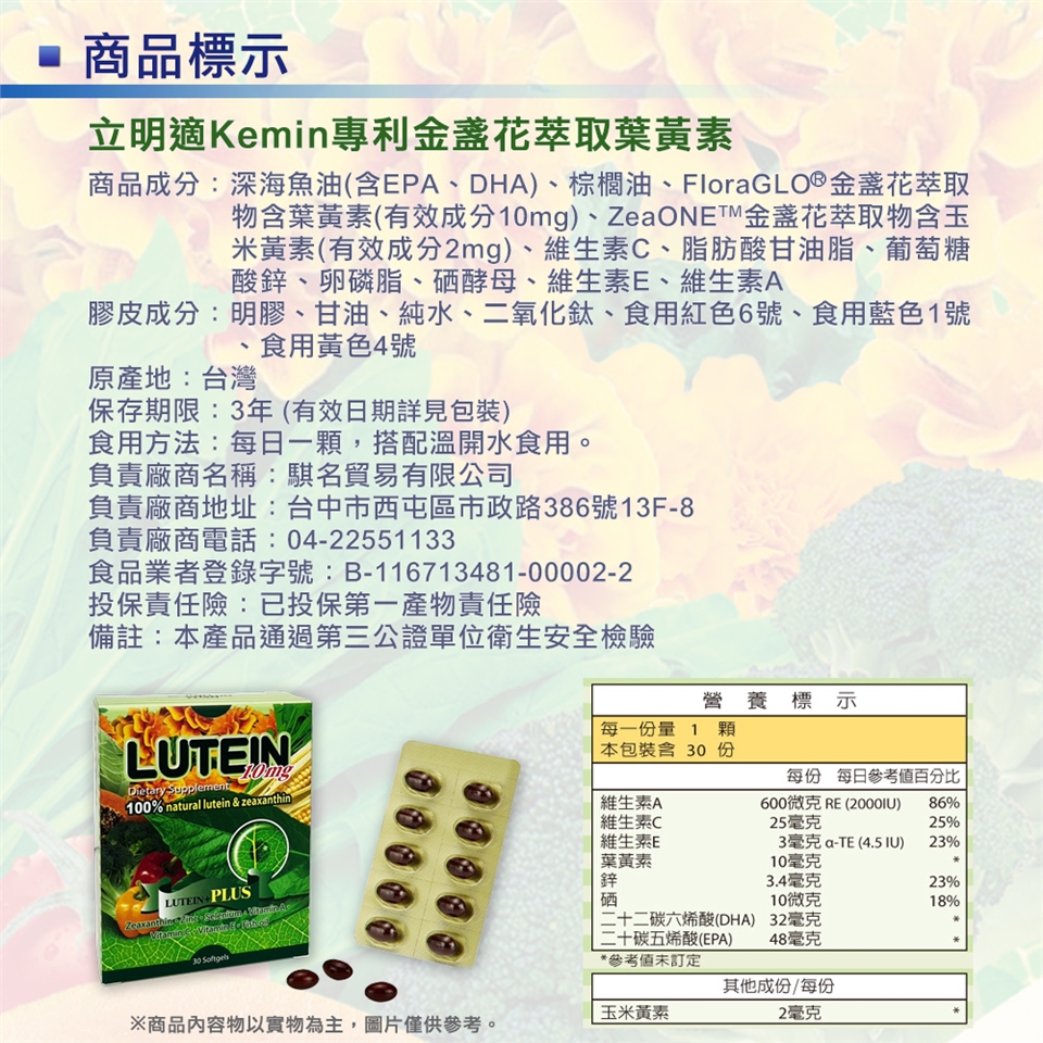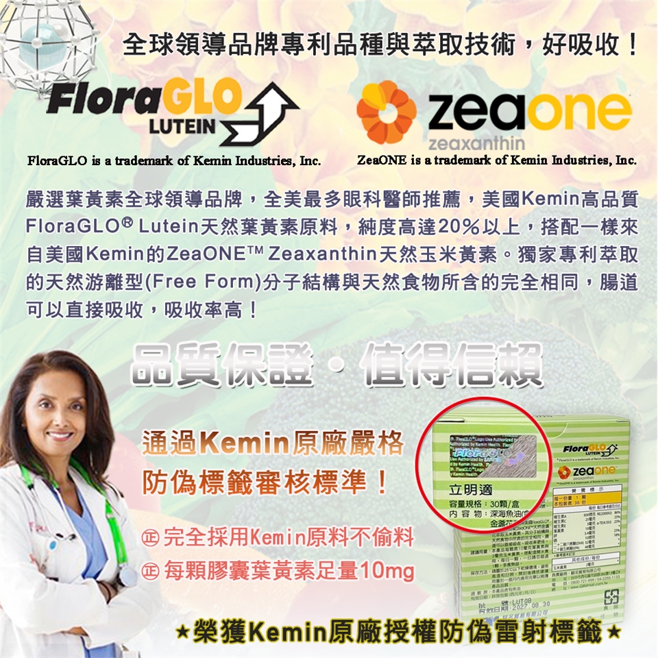 ☆榮獲kemin原廠授權使用防偽雷射標籤(外盒背面),100%採用kemin專利葉黃素且有效含量滿足人體所需!