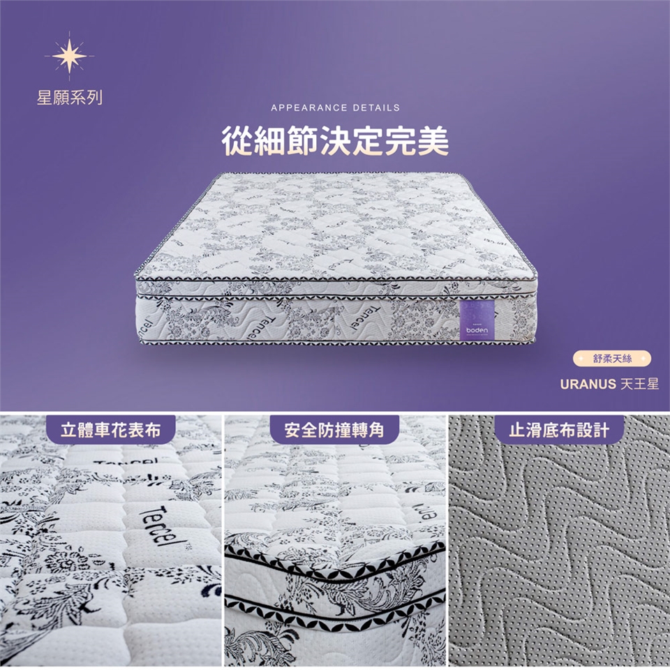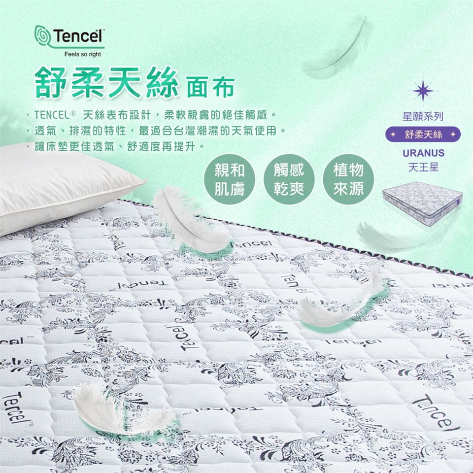 選用TENCEL天絲舒柔表布,100%天然植物性纖維,擁有絕佳的吸濕、親膚特性。
