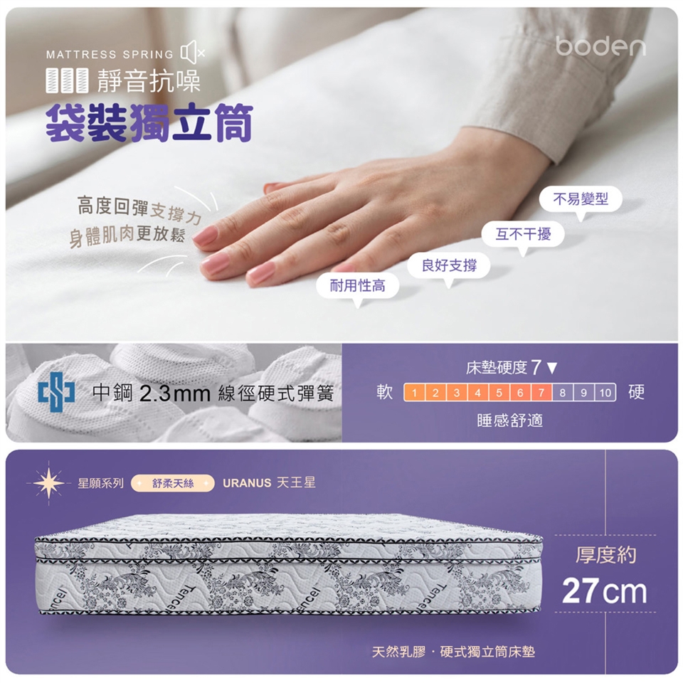 優質中鋼2.3mm線徑硬式彈簧,精準撐托,保護脊椎健康,提供您舒適的睡眠體驗。