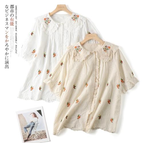 凜美日系夏季新款純棉娃娃領森女風刺繡短袖襯衫寬松休閑復古上衣