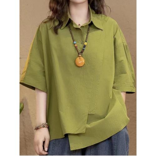 文藝純色休閑不規則全棉短袖襯衫女夏季寬松大碼顯瘦百搭翻領襯衣