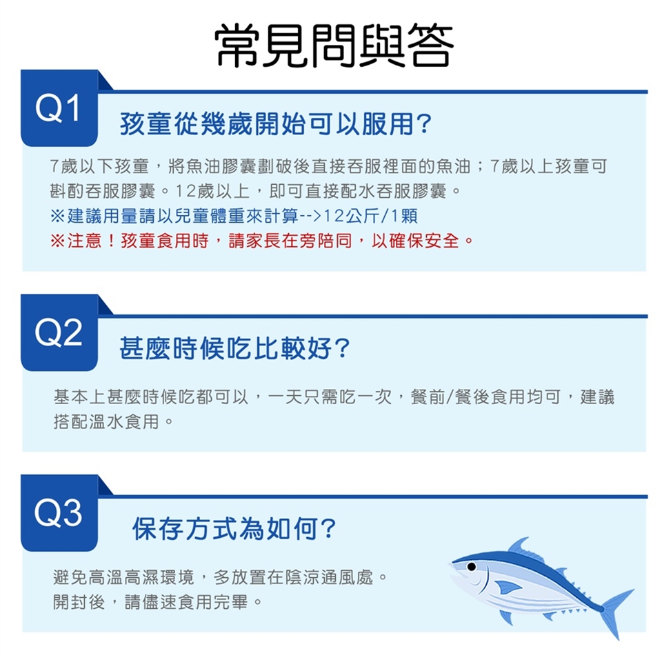 7歲以下孩童,將魚油膠囊劃破後直接吞服裡面的魚油;7歲以上孩童可斟酌吞服膠囊。