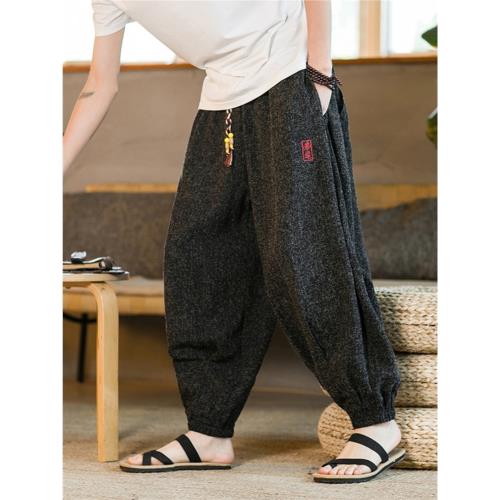 中國風刺繡棉麻九分褲男士春夏薄款大碼燈籠亞麻褲子寬松休閑褲潮