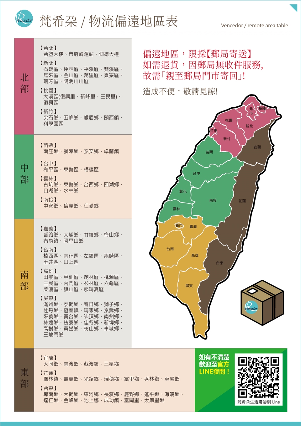 外島不寄送 本島偏遠地區會由郵局寄送. 不另外運費. 但日後若需退換貨. 需自行拿去郵局寄回