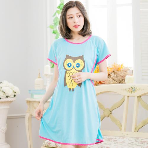 【lingling日系】全尺碼-貓頭鷹哺乳孕婦短袖連身裙居家睡衣(甜蜜藍)A3501-01