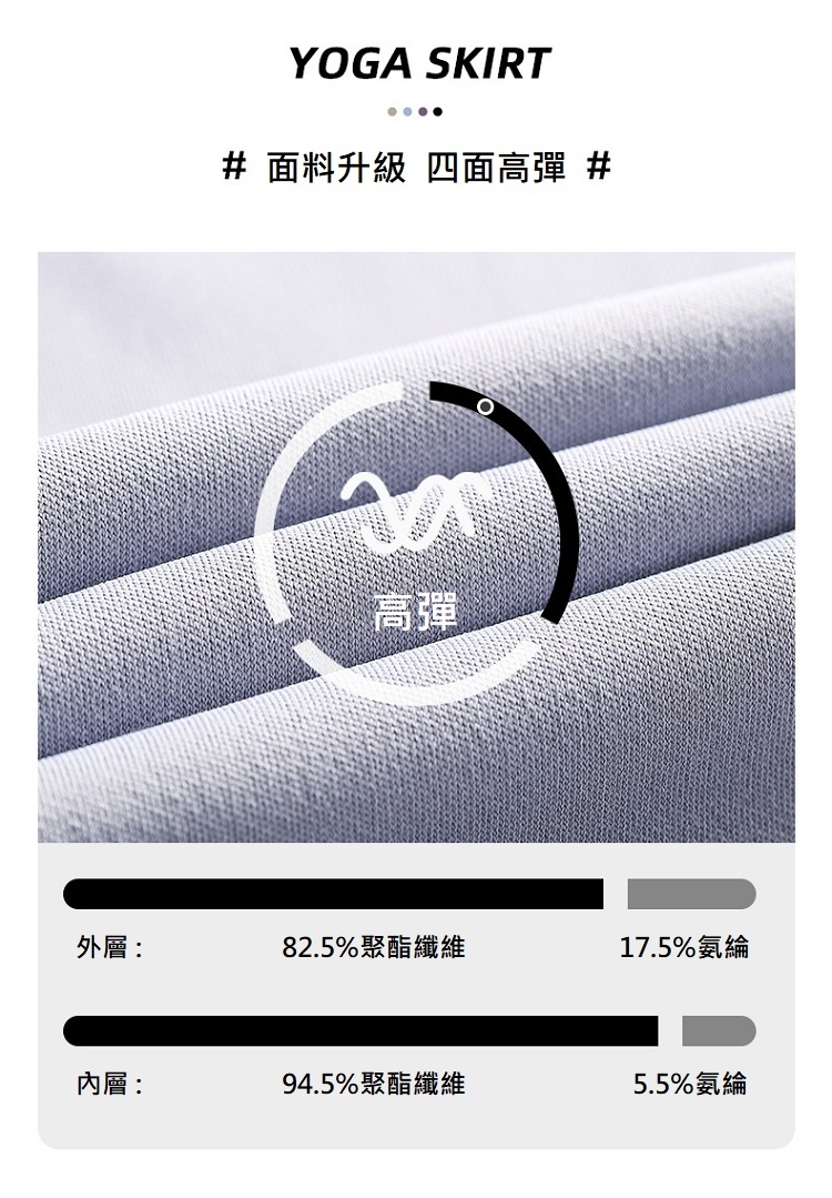材質:外層 : 82.5%聚酯纖維、17.5%氨綸 / 內層 : 94.5%聚酯纖維、5.5%氨綸