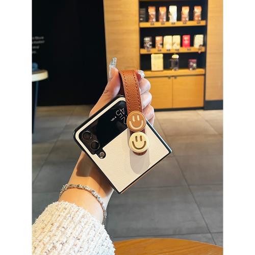 古皇笑臉適用三星zflip4手機殼w23flip折疊屏zflip3皮套手提小皮腕帶zflip5保護套zflip6可愛創意支架外殼