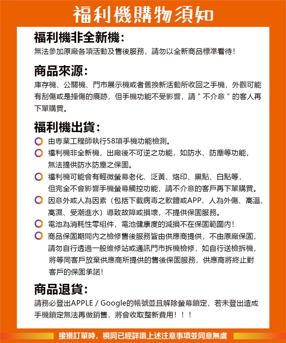 切勿使用密碼鎖機功能、軟體升級、包膜、IMEI碼上網註冊、刷機及其他會破壞手機原廠軟體的操作,如有上述情形發生將不受理退換貨